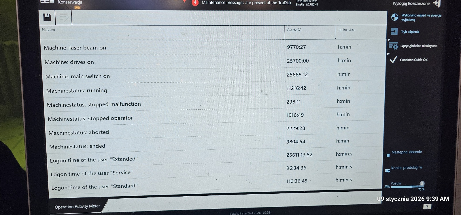 *Dane pochodzą bezpośrednio z systemu maszyny (Operation Activity Meter).